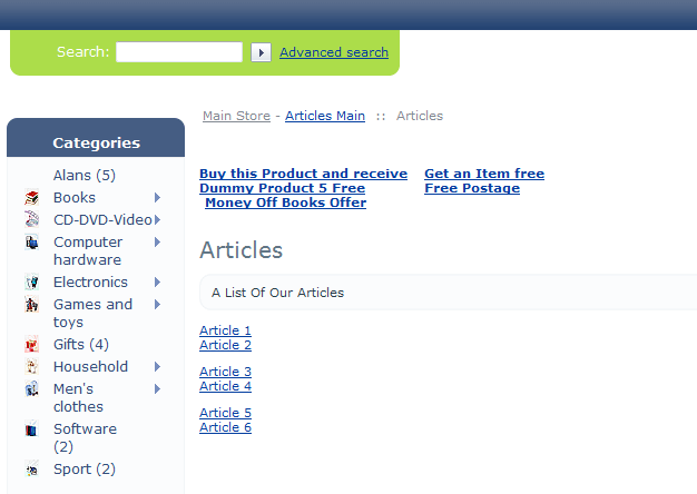 NO It doesn't show like you put, it will show Main Store > Articles Main > Article1 And so on like > Main Store > Articles Main > Article2 Articles Main (Articles) yes is the same page, And So what?, it's the starting point for articles with all articles grouped on same page, and user can be taken back easily to main articles page, as the original poster wanted............ The original poster asked for a workaround etc, I stepped in to show how it can be done, another user mentioned BCSE mod that could be modified, and you bash that as well. Wish you luck in a perfect world, unfortunately this is not the case, and also there are very good modders out there and coders that modify code to the best of what's possible to help others. |