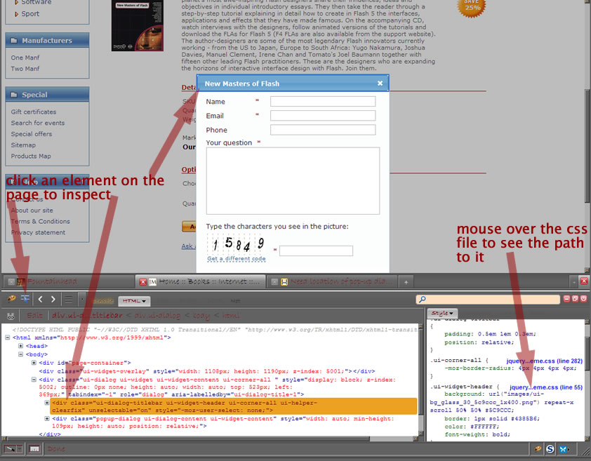 Select the "Click an element in the page to inspect" icon (2nd in main firebug menu next to the firebug icon) mouseover the popup and/or select the html is under the html tab, the css is in the style tab in the firebug console ---