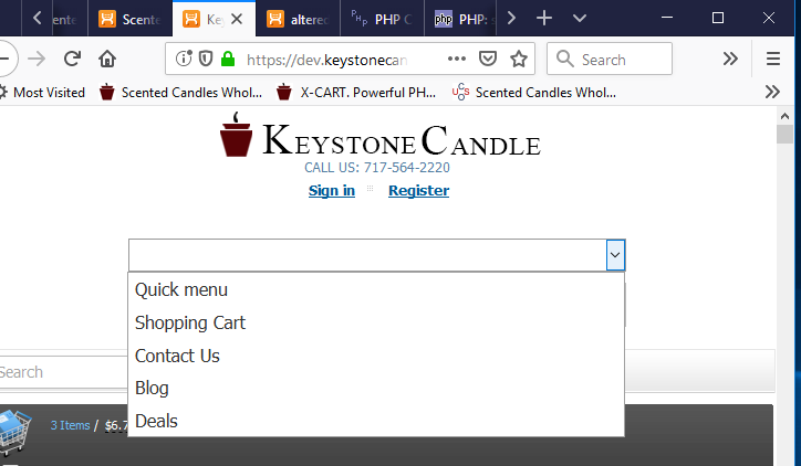 I am trying to make the speed bar and category links show up in drop down lists when the screen size is 767 px or less. I have it working on my 4.6.6 store php 5.4 but when I copy the code (and css) info over to my development 4.7.11 php7.2 site it doesn't quite work and I can't figure out why. They layout is showing up how I want, while the page is loading the first item in each of the drop downs shows up as text (so for the speed bar you can see Quick Menu and for the categories drop down, you can see Categories) but as soon as the page is finished loading, the text disappears and you can see 2 blank drop downs. If I click the drop down arrow I can see all the options just fine and when selected, they do what they are supposed to.