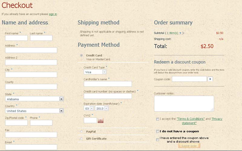 I have a resolution that may be useful for many that could have this issue but I am not well enough versed in code to accomplish the feat. There are two pictures attached to this post. One as the standard page and the second as the modified page (as I would like it). What I need is on the checkout page there is a check box at the bottom before the submit order button they have to check before being able to checkout and apply payment. What I would like is the 2 additional buttons one says I do not have a coupon... the other says the coupon is applied and shows a discount above..... The point is if they check the box that says no coupon... and then check the agree to terms they can go on to payment ... IF they Check I have applied coupon.... and there is no discount showing above... then they can not get passed that page. This will prompt them to make sure they have the coupon entered and the discount is applied. Hopefully this little radio button will keep me from having to credit their cards after the transactions for the discounts they assured me they added to the cart. I have created multiple users and checked with both logged in and new user not logged in and tested the functionality of the cart so I know it is working correctly. Thank you so much if you can help with this code and what would be needed. xcart version 4.4.3 nothing too special installed.