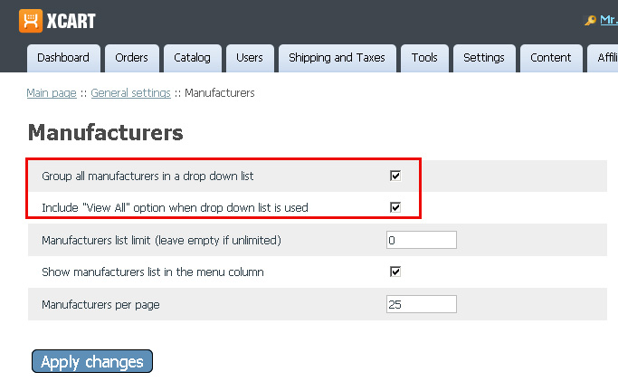 - manufacturers_menu_drop_down - by default it is checked. It will group all Manufacturers in a drop down list. If you uncheck it you will see the default XC behavior, using Manufacturers list limit value.