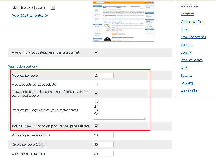 4) Variants for number of products per page can be changed as you want. You can enter one after other in a textarea box in Admin -> Appearance by pressing Enter button. Take in consideration how many columns for products are on a row (if you have 3, your variants of products per page should be multiply by 3). And also what is the default value (normally it should be the first value in selection menu).