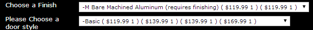 The "finish" set changes what color you would like the product to be, this actually has a price change. The "door style" set does not change price. [See attached image]
