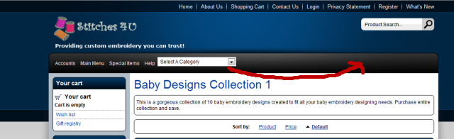 Thank you very much in advance for your help. Merry Xmas to all! Shareen {* $Id: categories.tpl,v 1.35 2009/05/12 07:37:15 max Exp $ vim: set ts=2 sw=2 sts=2 et: *} <div class="search"> <div class="valign-middle"> {if $active_modules.Fancy_Categories ne ""} {include file="modules/Fancy_Categories/categories.tpl"} {assign var="fc_cellpadding" value="0"} {else} {if $config.General.root_categories eq "Y"} <select name="listCategories" onchange="window.location=this.options[selectedIndex].value"> <option value=""><font class="VertMenuItems">Select A Design Category</font></option> {foreach from=$categories item=c} {if $c.order_by < 899 && $c.product_count ne 0} <option value="home.php?cat={$c.categoryid}"><font class="VertMenuItems">{$c.category}</font></option> {/if} {/foreach} </select> {else} {foreach from=$subcategories item=c key=catid} <font class="CategoriesList"><a href="home.php?cat={$catid}" class="VertMenuItems">{$c.category}</a></font><br /> {/foreach} {/if} {/if} </form> </div> </div>