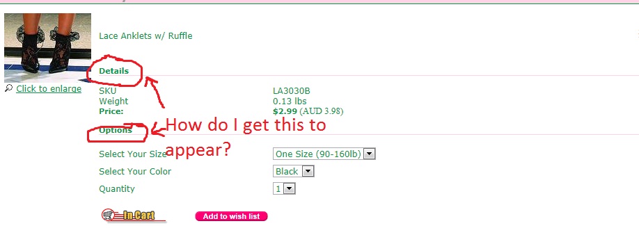 No, I need help putting the word details and options, for it to be seperated. In other words, I want it to display the words Details and Options. For instance, I want it to say Details on top of the details. AND Options for the customers can see it says what Options they have. Do you understand?
